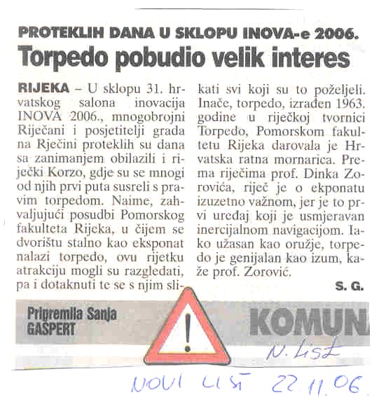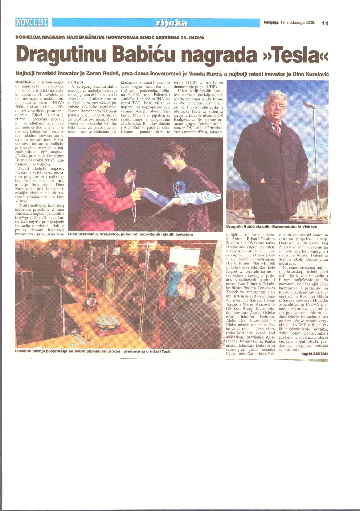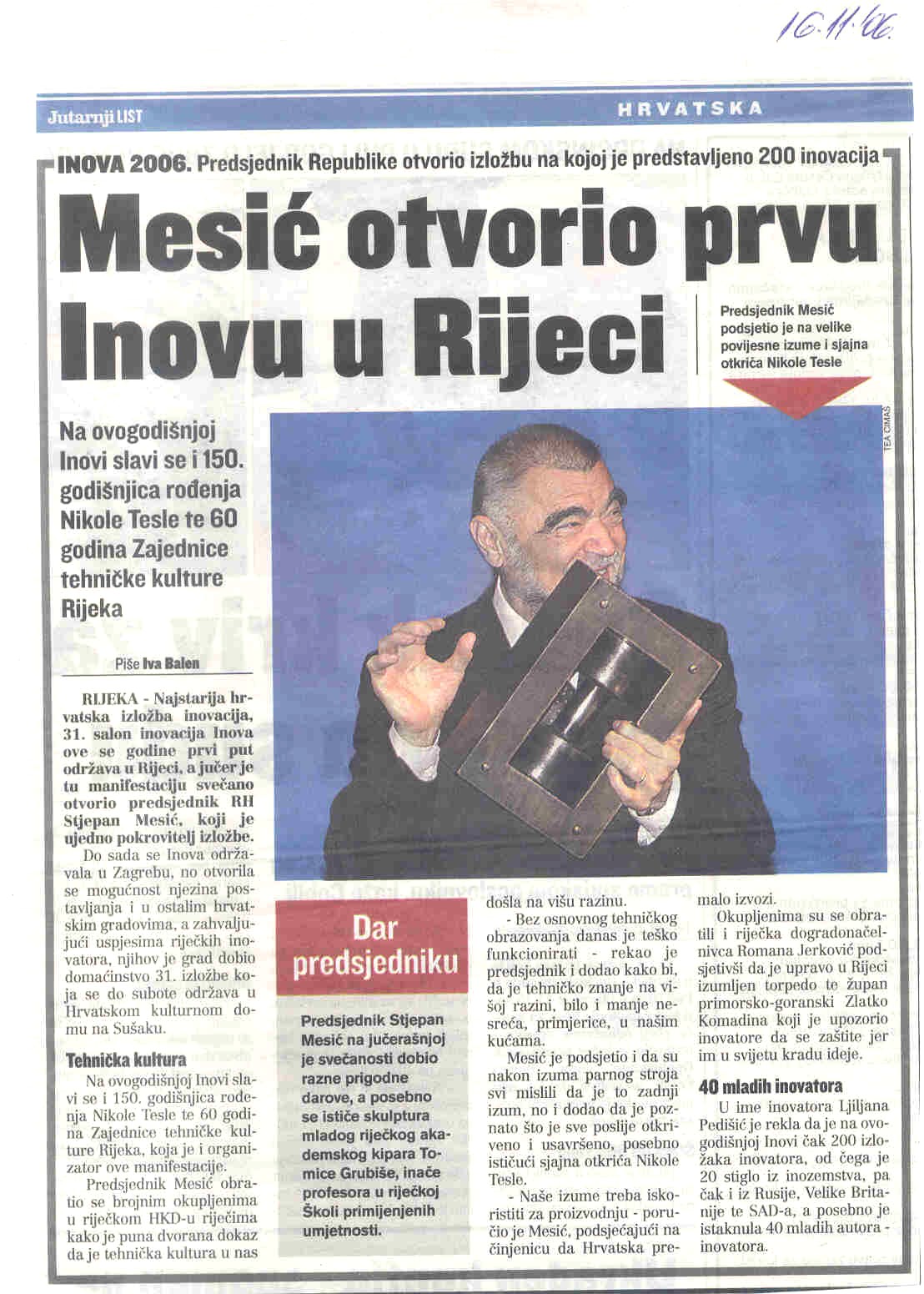 17.11.2006. RADIO RIJEKA - javljanje u Rijeka-info o događajima toga dana na Inovi - 8,00h (Iva Večerina) Prostorije HKD-a snimanje - KVK LIBURNIJA FILM RiTV- snimanje izložaka (inovacija) i snimanje demonstracija Teslinih izuma RADIO RIJEKA - Tatjana Sandalj, intervju sa inovatorima